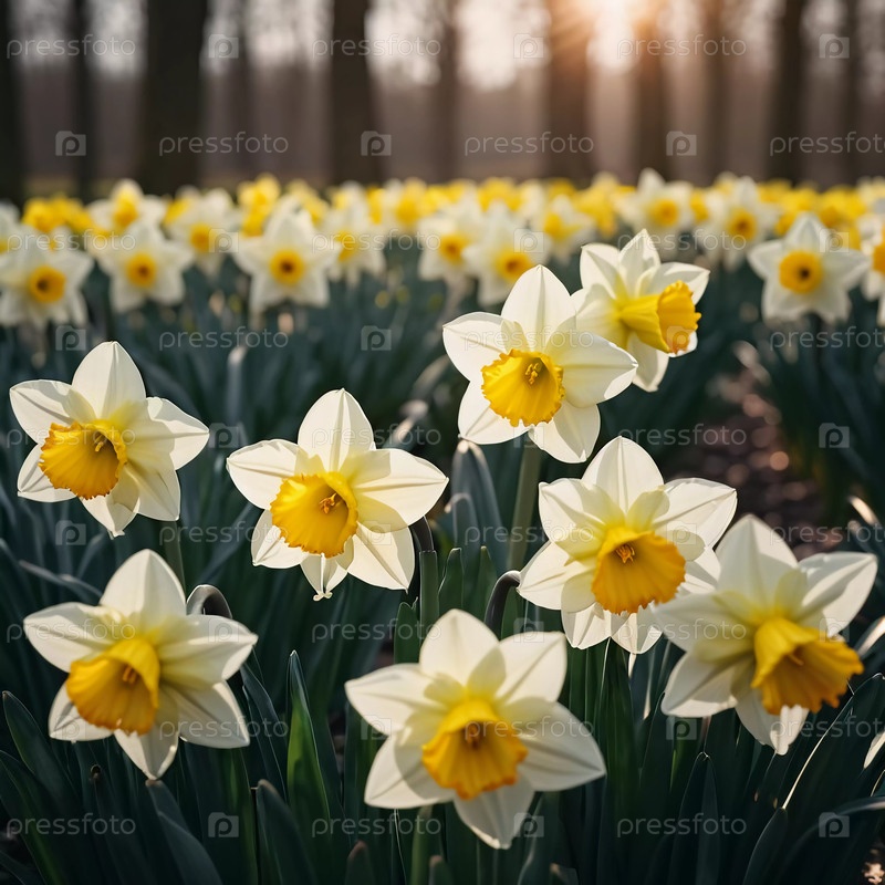Цветы нарцисса заполняют клумбу в саду, когда солнце заходит позади деревьев. белые листья и желтые центры создают красочный дисплей при мягком вечернем свете Generative AI