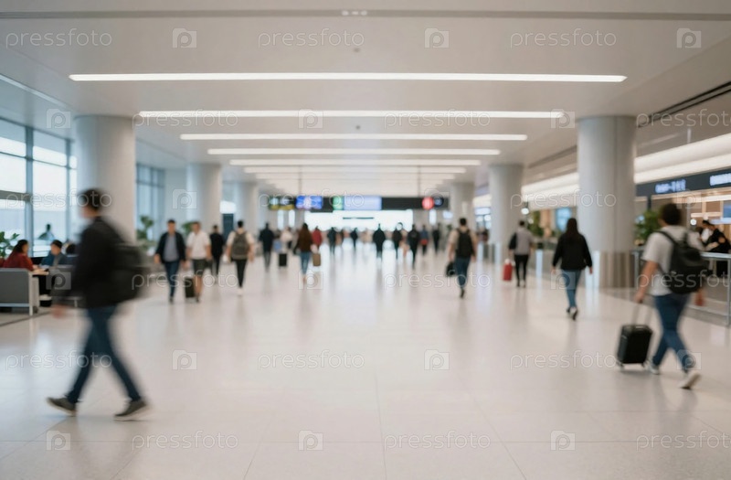 Многие люди проходят через терминал аэропорта. Пассажиры несут с собой багаж и общаются, перемещаясь между магазинами и зонами ожидания