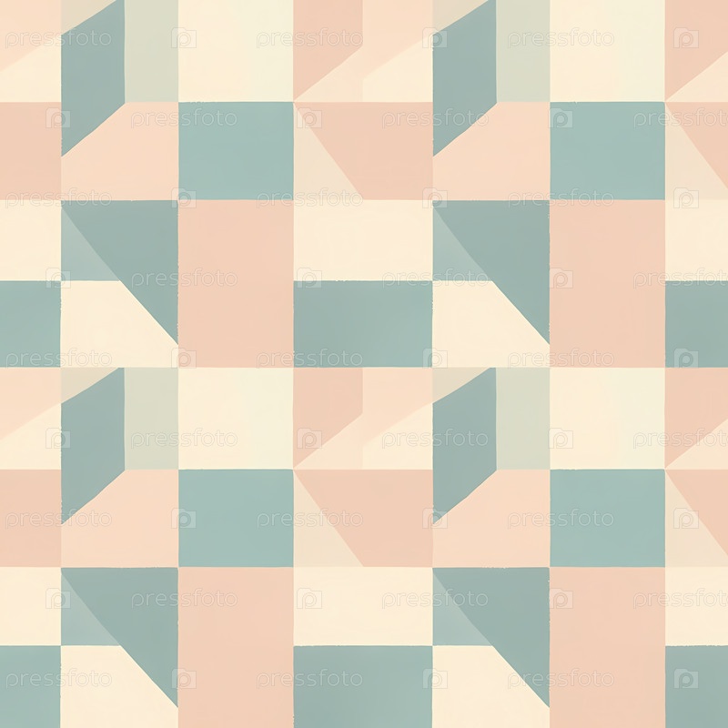 Плоская поверхность показывает геометрический рисунок, состоящий из квадратов и треугольников.В дизайне присутствуют пастельные цвета, включая мягкий розовый и светло-синий.Формы перекрываются в четкой планировке Generative AI