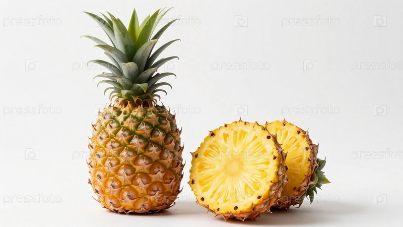 Ананас стоит прямо на белой поверхности с двумя кусочками, расположенными рядом.Весь плод показывает свою зеленую верхушку и текстурированную кожуру.Крышки раскрывают ярко-желтую плоть Generative AI