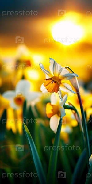 Цветки нарцисса стоят высоко в клумбе, когда заходит солнце.Цветы демонстрируют свои яркие цвета на фоне меняющегося неба.Красота природы выставляется в конце дня Генеративный ИИ