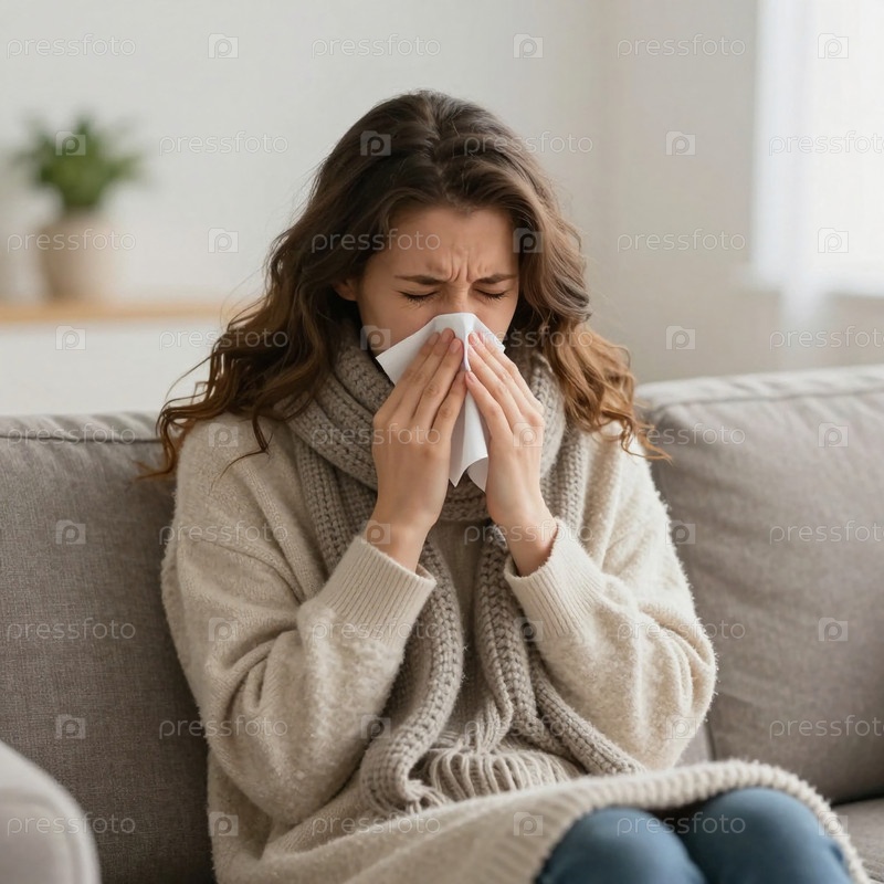 Женщина сидит на диване в своем доме. Она дует себе в нос салфеток. Ей нехорошо и она одета тепло. Комната яркая с естественным светом, поступающим из генеративного ИИ