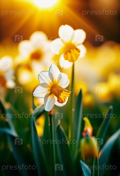 Яркие листья сияют в теплом свете, создавая оживленную сцену с многочисленными цветами, цветущими вместе Generative AI
