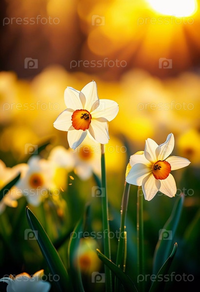 Яркие цветы нарцисса растут в клумбе, когда солнце садится на задний план.Цветы привлекают внимание своей простой красотой весной Generative AI