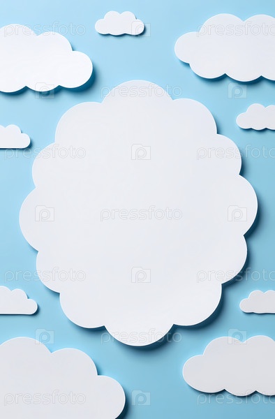 Креативные бумажные вырезки облаков расположены на синем фоне. Дисплей включает в себя различные формы и размеры облаков. Эта установка придает любому пространству забавный вид Генеративное ИИ