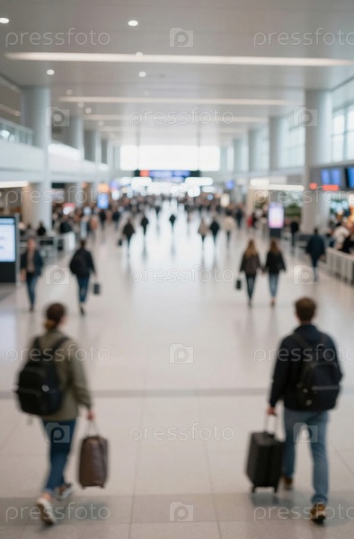 Люди гуляют по терминалу аэропорта, некоторые несут чемоданы и багаж.Сцена показывает оживленную среду с многочисленными туристами и пассажирами, перемещающимися вокруг Генеративный ИИ