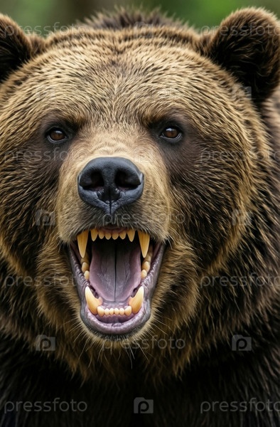 Медведь стоит в лесу, показывая свои острые зубы. Животное кажется готовым защищаться. Солнечный свет фильтрует через деревья, добавляя к сцене генеративный ИИ