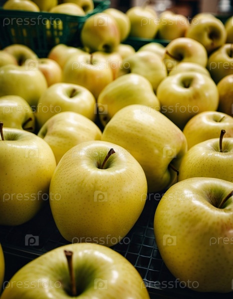 Красочный ассортимент желтых яблок аккуратно расположен на стойке супермаркета, приглашая клиентов исследовать и выбирать свежие фрукты