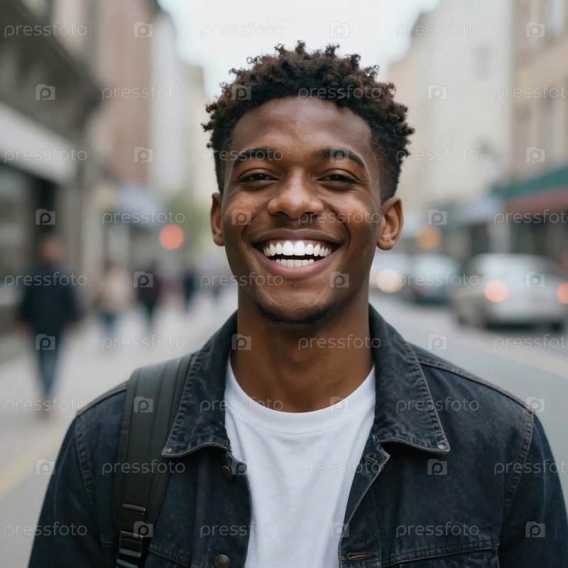 Молодой человек идет по оживленной городской улице. Он смеется и показывает зубы. Люди проходят мимо него. Атмосфера жизнерадостная. Это яркий день Generative AI