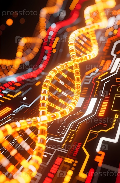 Впечатляющая спиральная ДНК светит ярко-оранжевым цветом на фоне сложных схематических моделей, захватывая слияние биологии и технологий в увлекательном визуальном дисплее Generative AI
