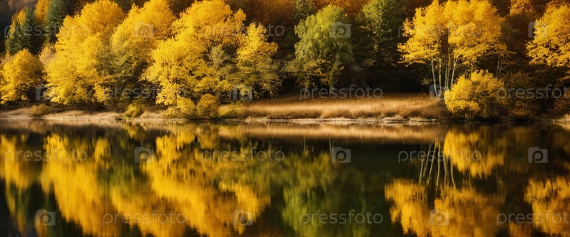 Вибрирующие желтые листья создают потрясающий осенний дисплей вокруг спокойного озера с отражениями, отражающими листву на поверхности воды по мере того как день подходит к концу