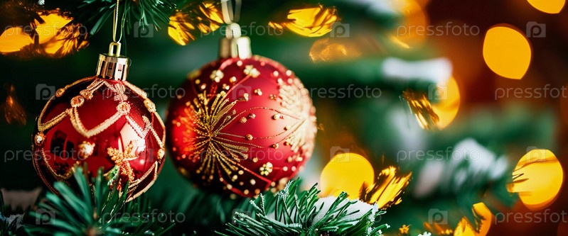 Сверкающие орнаментальные шары в ярко красном и золотом цветах висят на ветке пышной ель. Мягкие теплые огни мерцают, улучшая праздничный дух Рождества. С Новым годом. Анаморфический боке. Генеративный ИИ