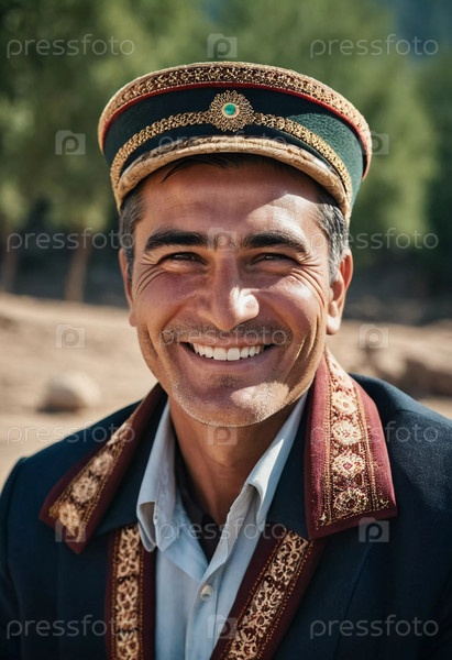 Веселый 45-летний таджикский мужчина в традиционной одежде с яркой улыбкой на потрясающем фоне, излучающий тепло и счастье