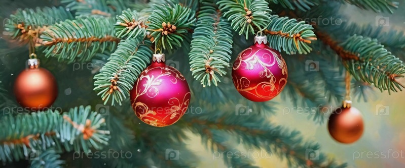 Красочные рождественские украшения украшают ветви пихты, яркие шары в оттенках красного, золотого и розового цветов, воплощающие праздничное настроение зимой