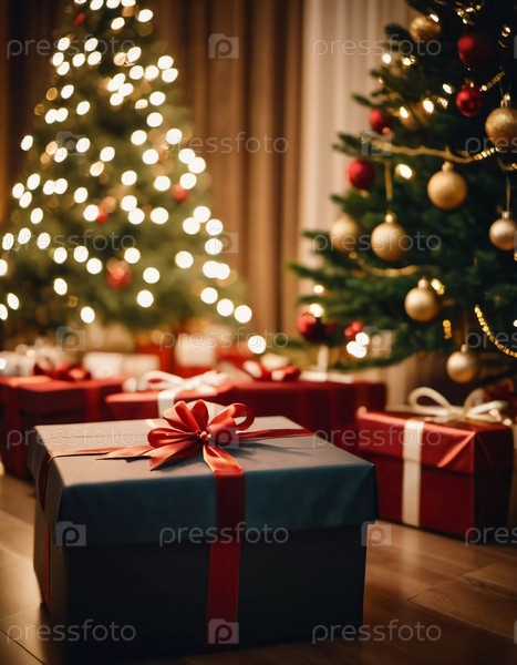 Празднично упакованные подарки в окружении красочных рождественских шаров под красиво украшенной пихтой во время радостного новогоднего сезона