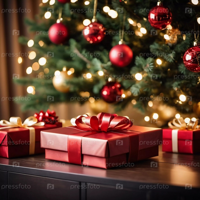 Празднично упакованные подарки в окружении красочных рождественских шаров под красиво украшенной пихтой во время радостного новогоднего сезона