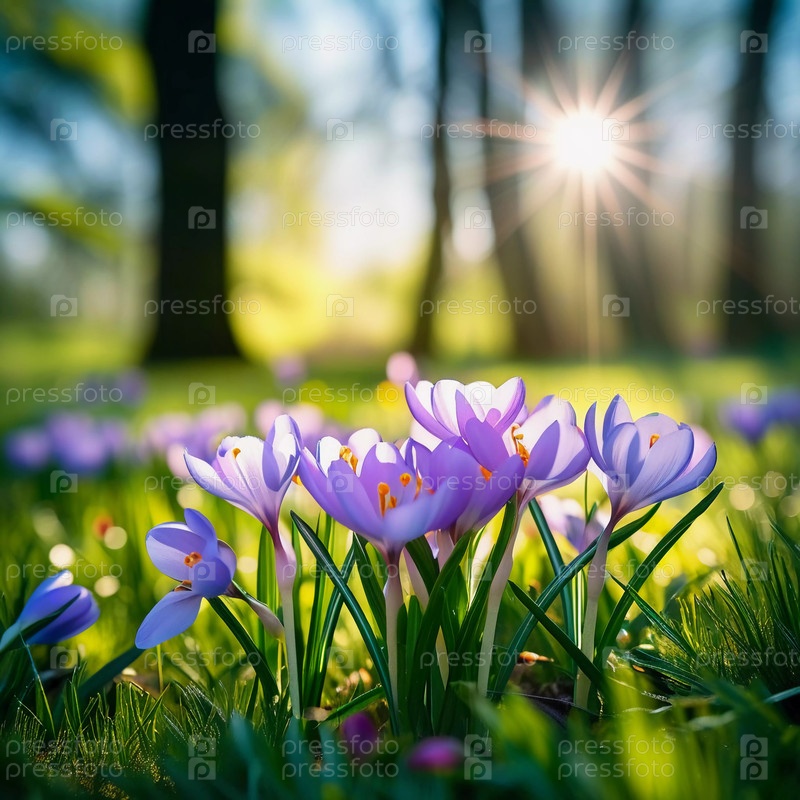 Нежные розовые цветы крокуса расцветают в пышной зеленой траве, солнечный свет в тихой весенней обстановке. Возрождение природы. Шафран Крокус - род многолетних луковичных травных растений семейства Ирис Iridaceae