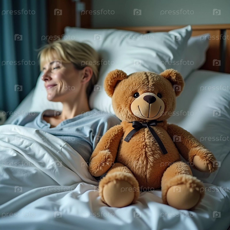 Женщина лежит в больничной постели, рядом с ней расположен мягкий плюшевый медведь.Несмотря на трудности, она находит утешение и тепло в своем пушистом спутнике, излучающем надежду и мужество