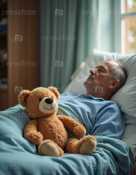 В тихой больничной палате пожилой человек спокойно отдыхает, обнятый мягкими одеялами и любимым плюшевым медведем