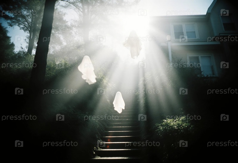Призрачные фигуры парят над лестницей в жуткой обстановке Хэллоуина.Мягкий солнечный свет фильтрует через деревья, создавая жуткую атмосферу.Сцена захватывает дух сезона Generative AI