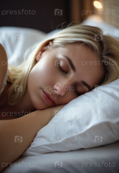 Мирная блондинка спокойно спит в уютной кровати, окружена мягкими подушками и безмятежной ночной атмосферой. генеративный ИИ. молодая блондинка мирно спит в постели, наслаждаясь тихим моментом