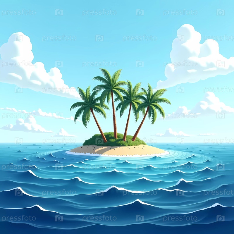 Красивый тропический остров выходит из голубого океана, украшенный раскачивающимися пальмами, достигающими неба, создавая мирную и приглашающую атмосферу Generative AI