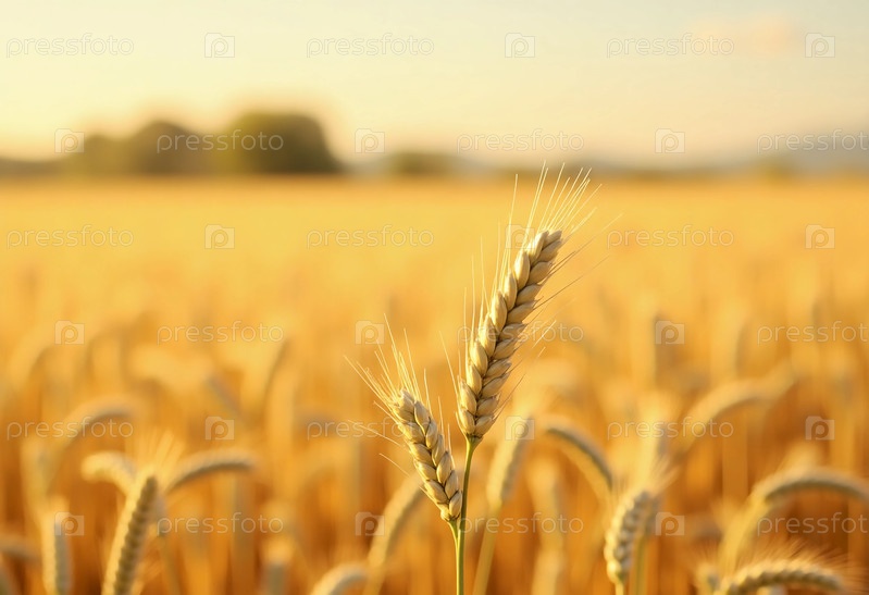 Золотые стебли пшеницы стоят высоко на фоне мягкого солнечного света, создавая спокойную атмосферу в сельской местности при переходе дня к закату