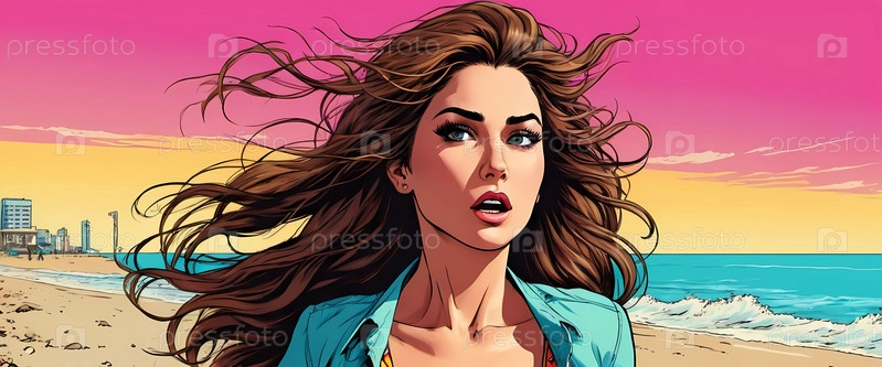 Женщина наслаждается оживленным днем на пляже, бегая вдоль береговой линии в купальнике, ее длинные волосы свободно текут в океаническом бризе, а волны мягко обнимают ее ноги