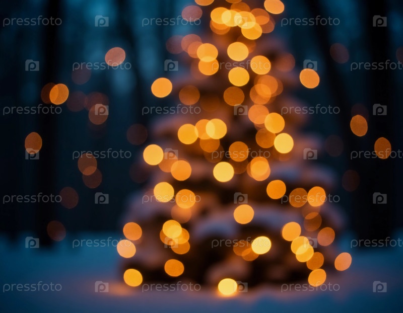 Спокойный лес, покрытый мягким снегом, имеет красиво освещенную рождественскую елку, украшенную сверкающими гирляндами Generative AI