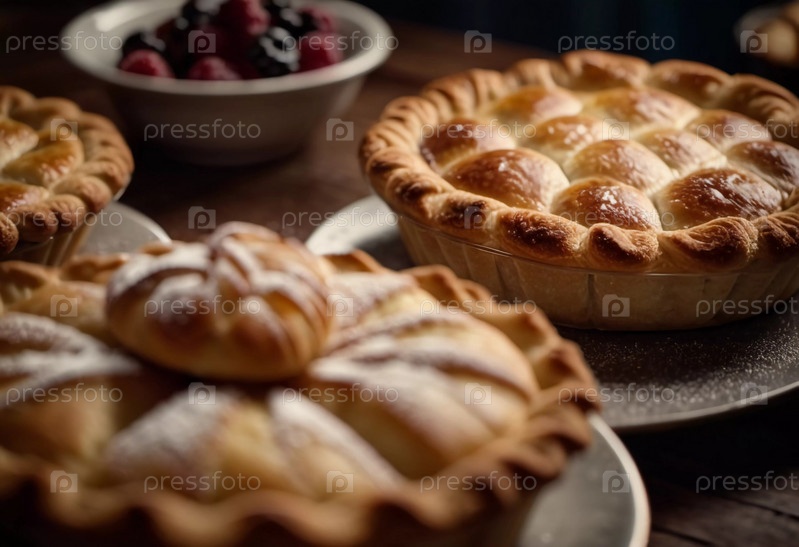 Свежевыпеченные кондитерские изделия и пироги привлекательно расположены на столе в теплой пекарне