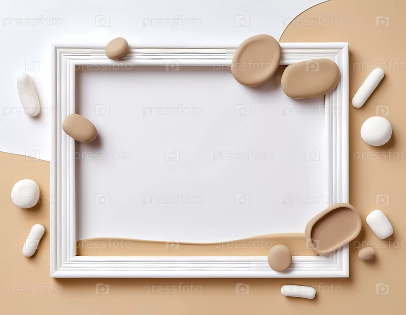 Пустая прямоугольная рама окружена различными абстрактными бежевыми и белыми формами на минимальном фоне хаки, идеально подходит для демонстрации творчества