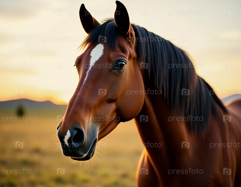 Золотой свет купает поразительную коричневую лошадь, захватывая зрителя своим нежным взглядом.На тихом пастбище лошадь грациозно стоит, когда день угасает в сумерках Generative AI