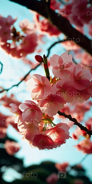 Нежные розовые вишневые цветки красиво цветут на ветке дерева во время весеннего сезона, заполняя сцену яркими цветами и ощущением обновления в природе