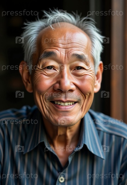 Пожилой мужчина из Китая делится искренней улыбкой, его лицо отражает всю жизнь переживаний и радости.На фоне слабо освещенного фона этот момент излучает теплоту и спокойствие Generative AI