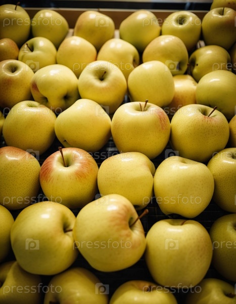Красочный ассортимент желтых яблок аккуратно расположен на стойке супермаркета, приглашая клиентов исследовать и выбирать свежие фрукты