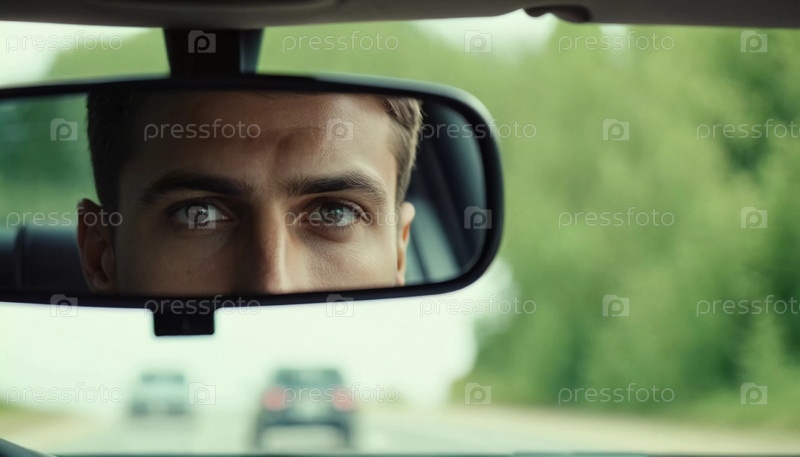 Молодой водитель мысленно смотрит в зеркало заднего вида во время круиза по тихой дороге, граничащей с лесом.Теплый свет захода солнца подчеркивает спокойное окружение.Генеративный ИИ