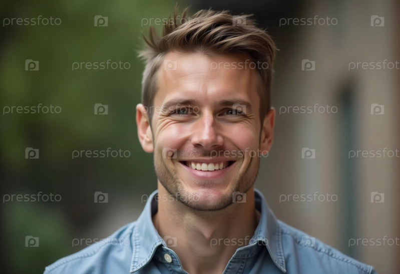 Веселый молодой симпатичный мужчина 30 лет, житель США, с короткими волосами и ухоженной бородой тепло улыбается в повседневной одежде. Мягкое освещение улучшает дружественную атмосферу