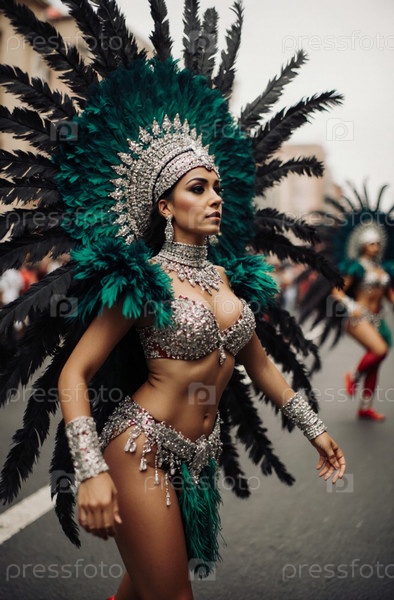 Вибрирующее празднование мексиканского карнавала демонстрирует ослепительную женщину, украшенную красочными перьями и искрящимися драгоценностями в оживленном уличном параде Generative AI