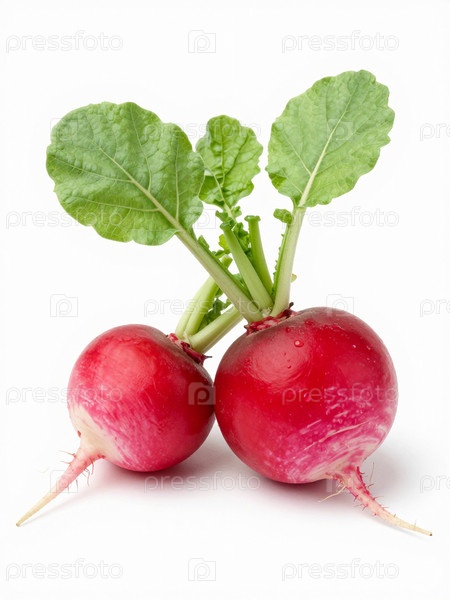 Два ярко-красных редиса с свежими зелеными листьями находятся на гладкой белой поверхности, демонстрируя свои восхитительные цвета и естественную красоту в простом, но поразительном дисплее Генеративный ИИ