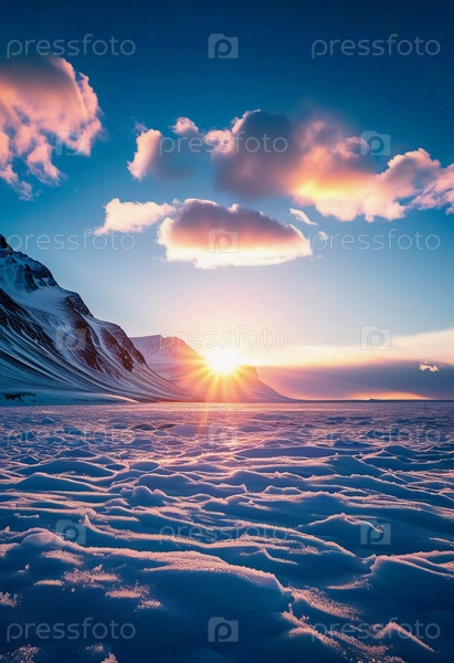 Спокойный арктический ландшафт тундры покрыт морозом при восходе солнца, излучая золотистый свет над ледяной местностью и освещая тонкие образования льда