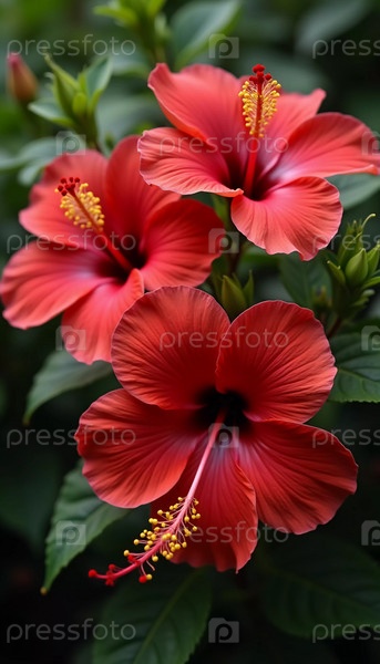 Ярко-красные цветы гибискуса демонстрируют сложные лепестки в процветающем саду. пышная зелень создает яркий фон для их красоты