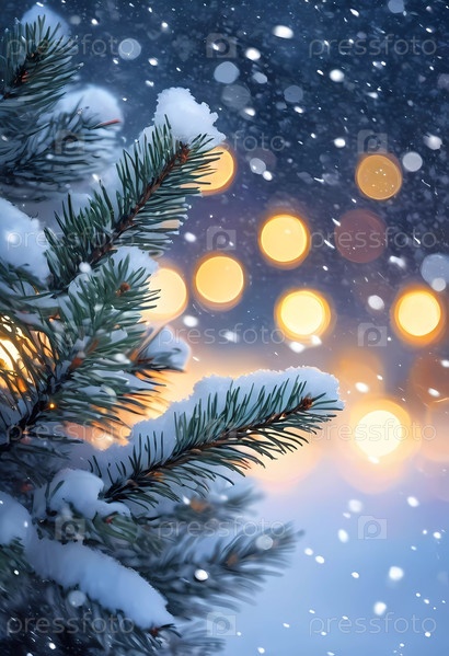 В спокойную снежную ночь мягкие боке-рождественские огни украшают еловые ветви среди живописного пейзажа. Видны уютные дома, излучающие тепло и празднование в стране зимних чудес