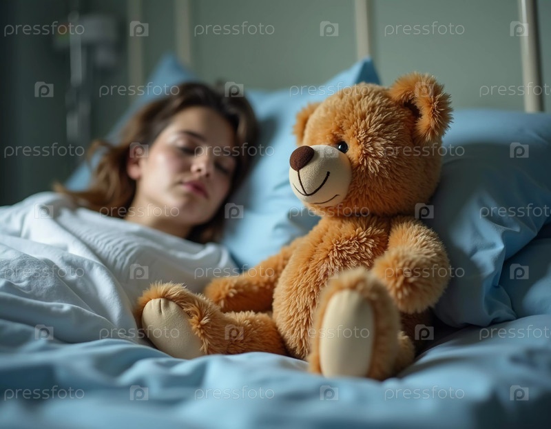 В спокойной больничной палате женщина мирно спит, в сопровождении мягкого плюшевого медведя.Теплая игрушка символизирует надежду и утешение на фоне ее борьбы за выздоровление и благополучие