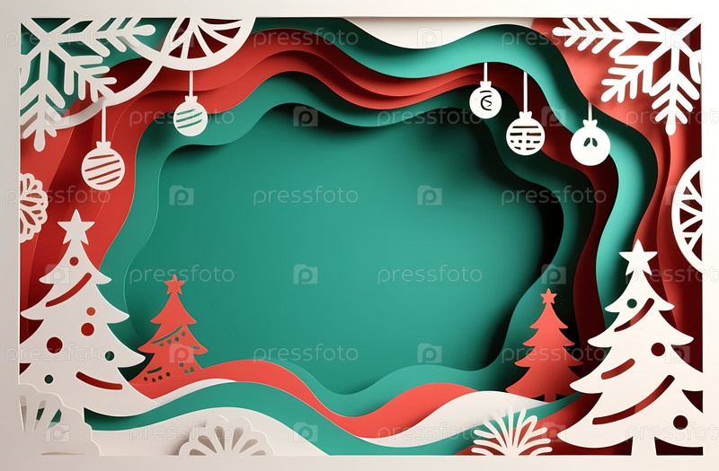 Этот дизайн имеет слойный фон, показывающий различные формы на Новый год и Рождество.Он включает рождественские елки, снежинки и украшения в разных цветах Generative AI