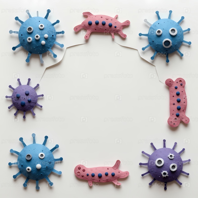 Красочные микробы вируса пластилина расположены в кругу на белом фоне.Микробы имеют различную форму и формы.Эта установка выделяет распространенные типы вирусов Generative AI