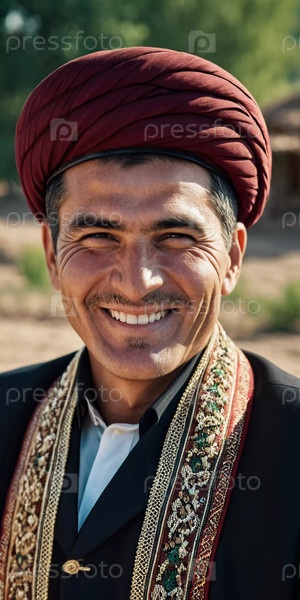 Веселый 45-летний таджикский мужчина в традиционной одежде с яркой улыбкой на потрясающем фоне, излучающий тепло и счастье