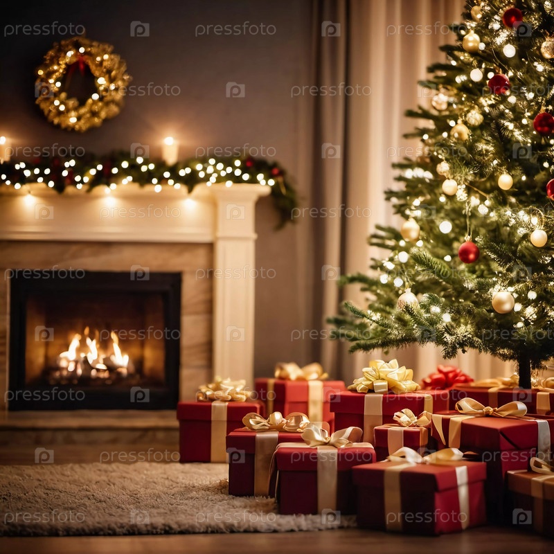 Празднично упакованные подарки в окружении красочных рождественских шаров под красиво украшенной пихтой во время радостного новогоднего сезона