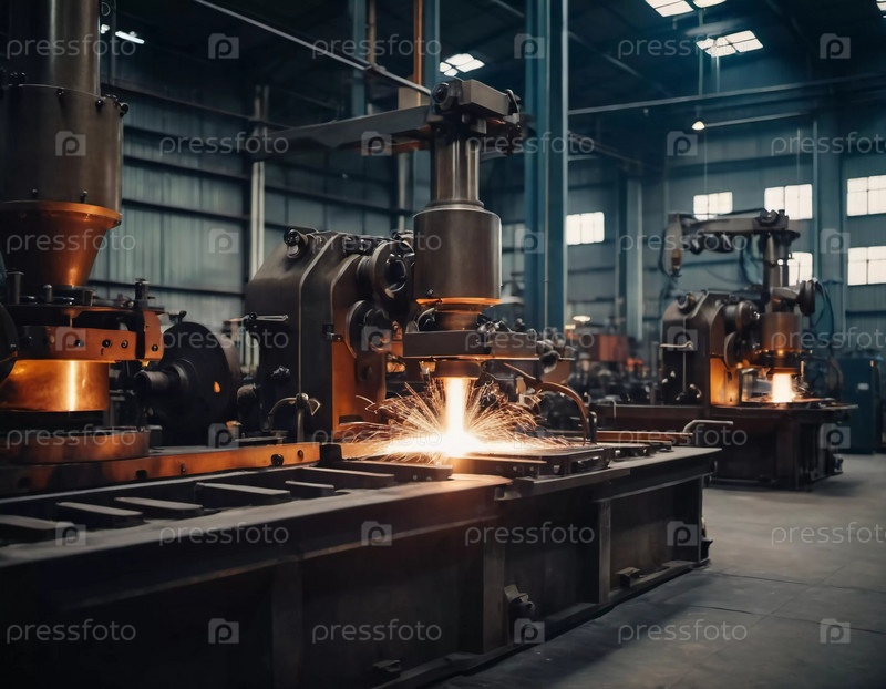 Производственный литейный завод, заполненный фрезерными машинами, активно производит компоненты.Окружающая среда промышленная, характеризуется машинным инструментом, видимыми искрами, предполагающими точную работу