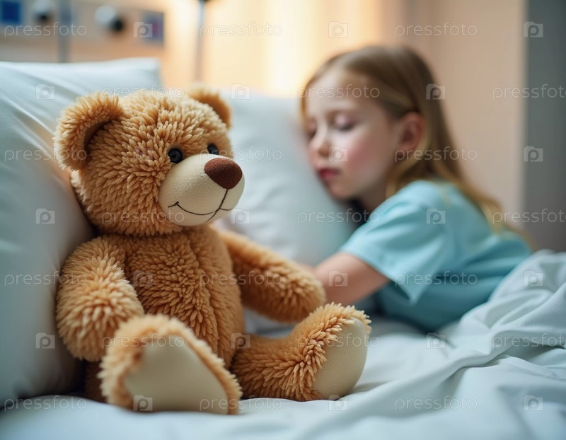 Молодая девушка спокойно отдыхает в больничной постели, ее беспокойства успокаиваются рядом с ней мягким плюшевым медведем