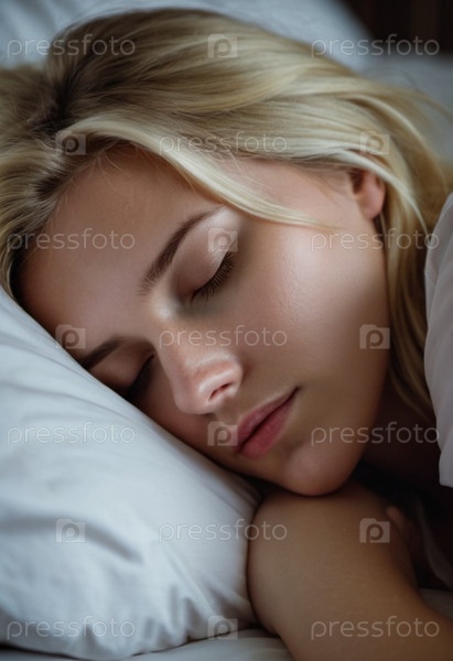 Мирная блондинка спокойно спит в уютной кровати, окружена мягкими подушками и безмятежной ночной атмосферой. генеративный ИИ. молодая блондинка мирно спит в постели, наслаждаясь тихим моментом